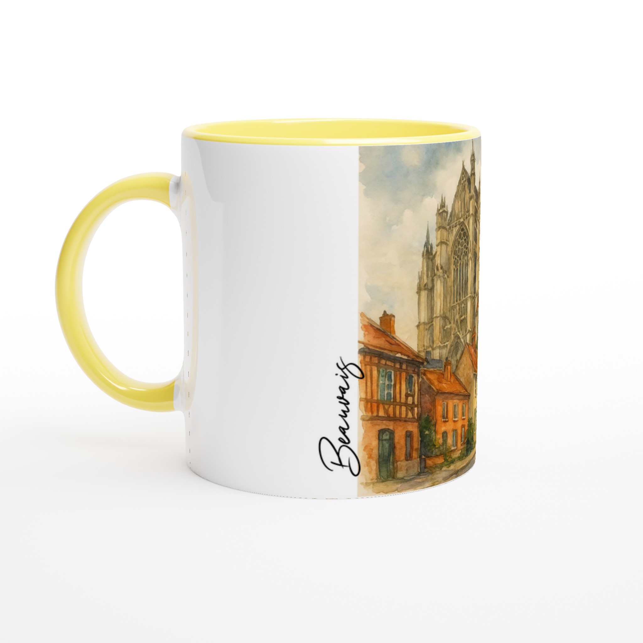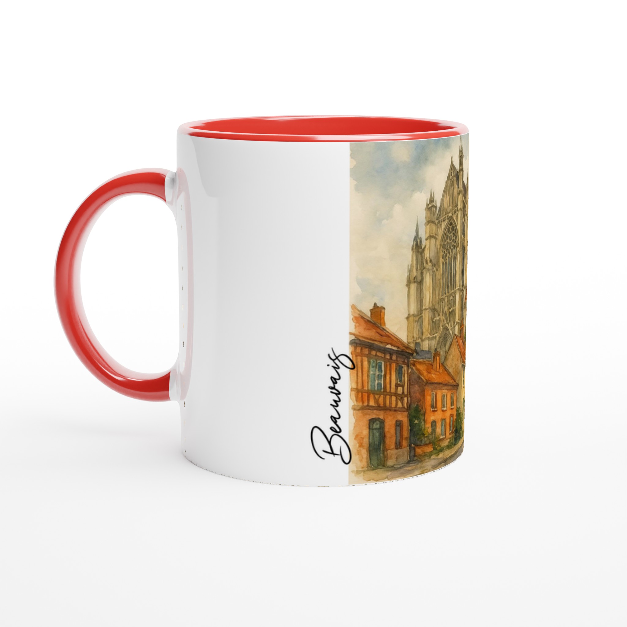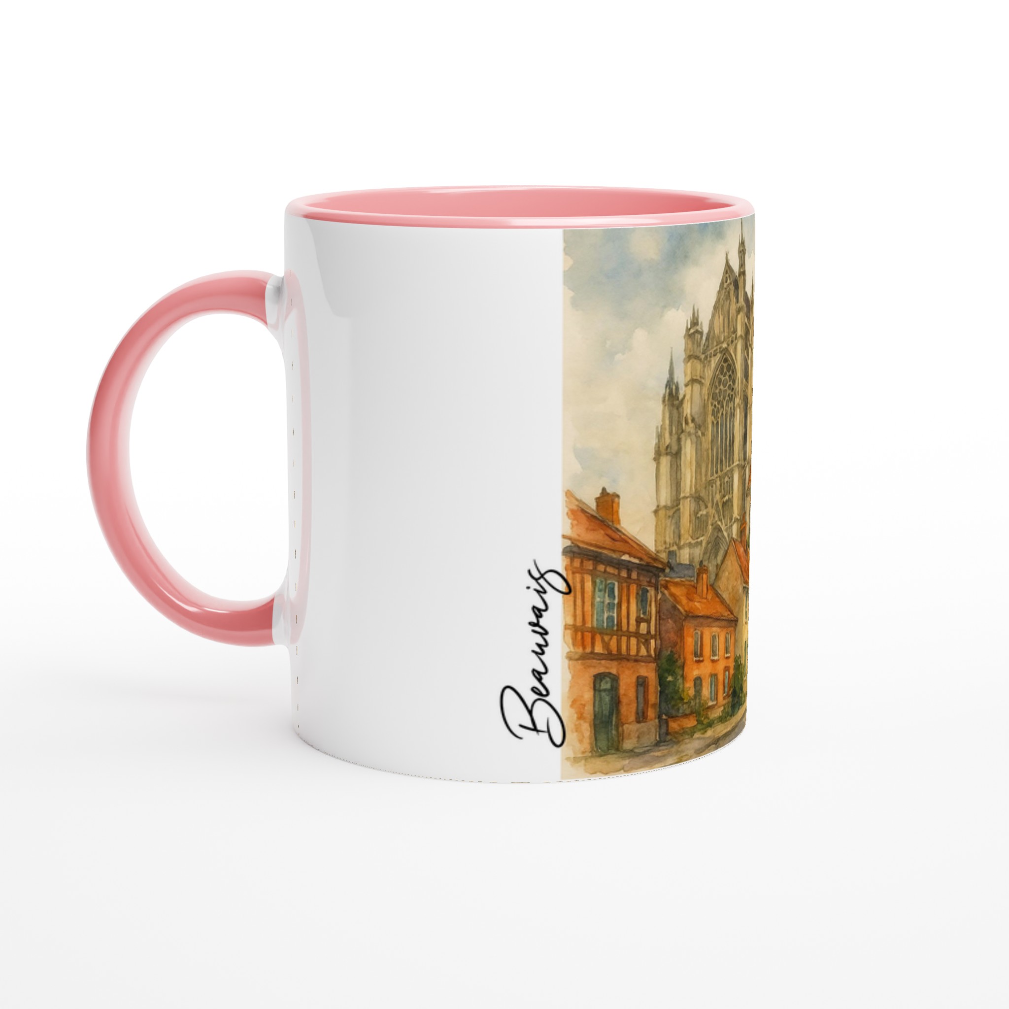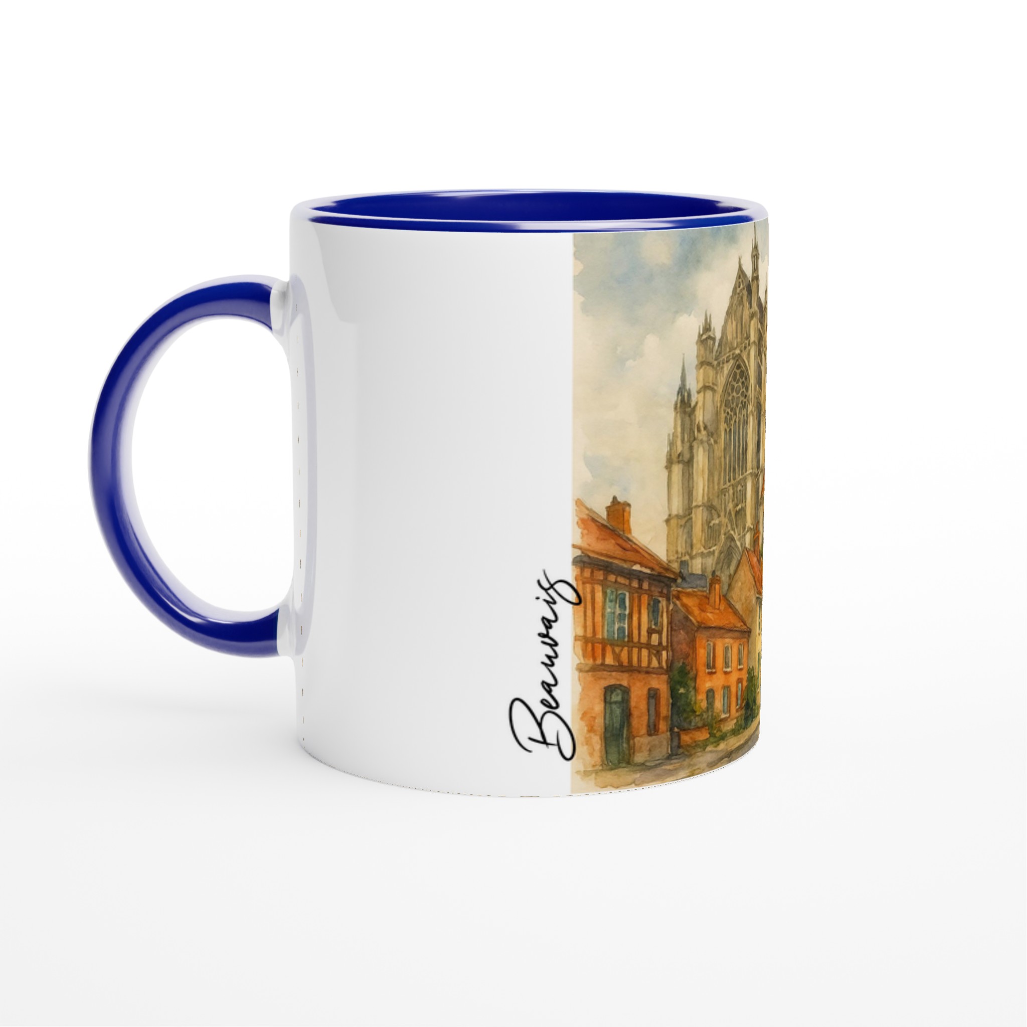 Mug en céramique Beauvais illustré d’une aquarelle de la cathédrale Saint-Pierre et des maisons anciennes. Intérieur coloré, impression HD durable, compatible micro-ondes et lave-vaisselle.