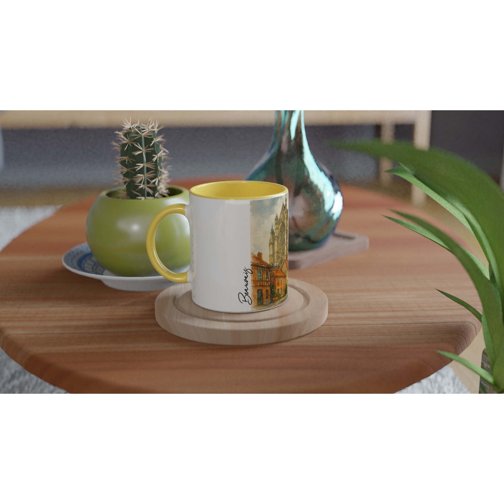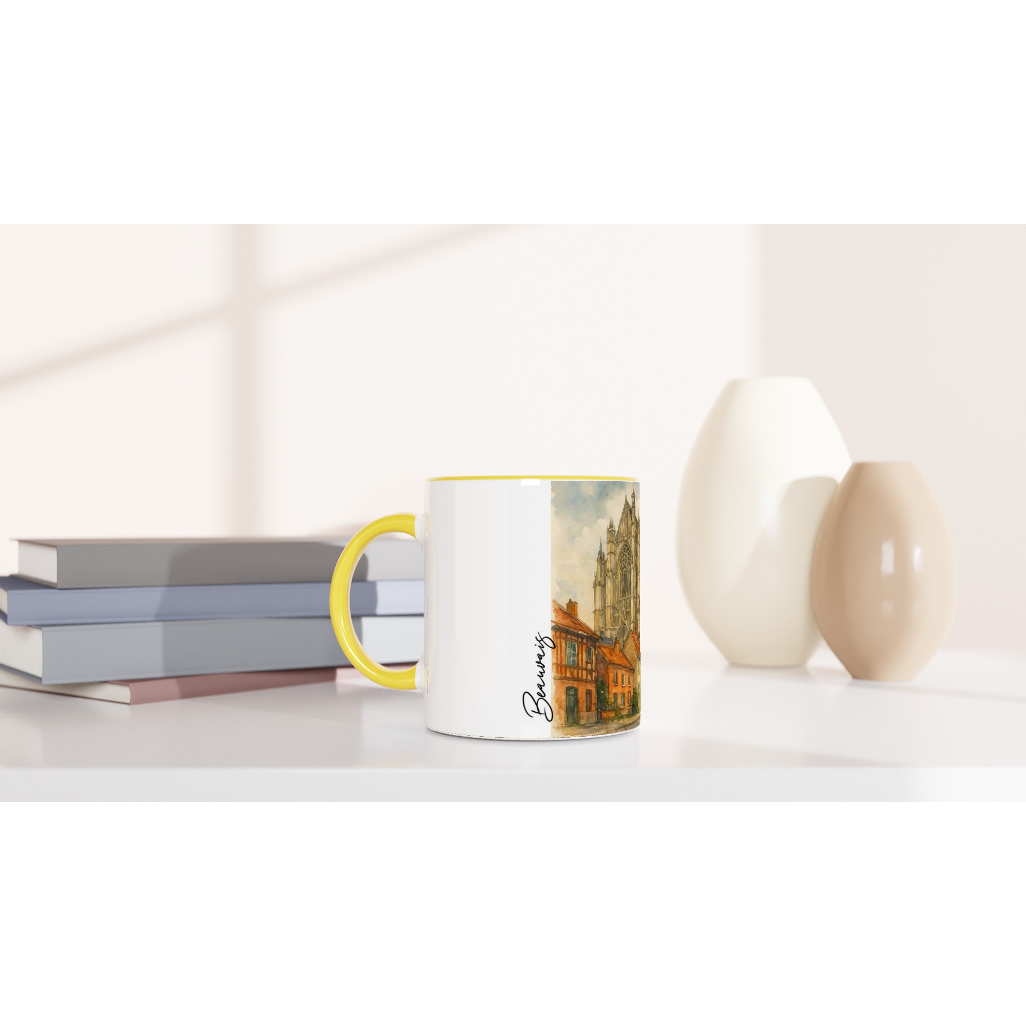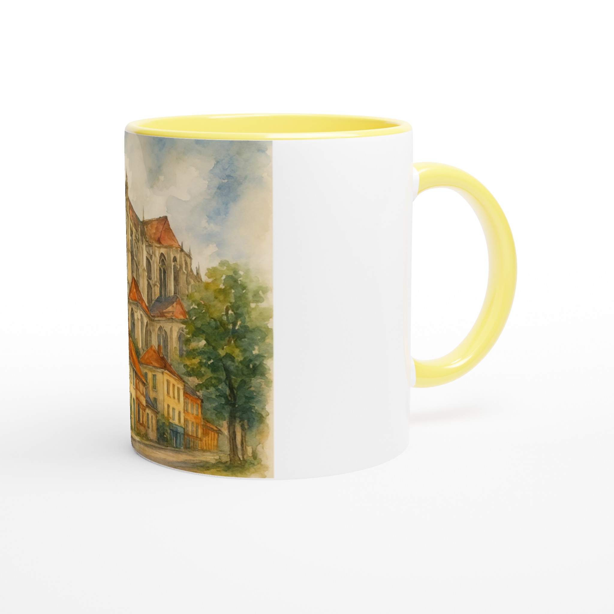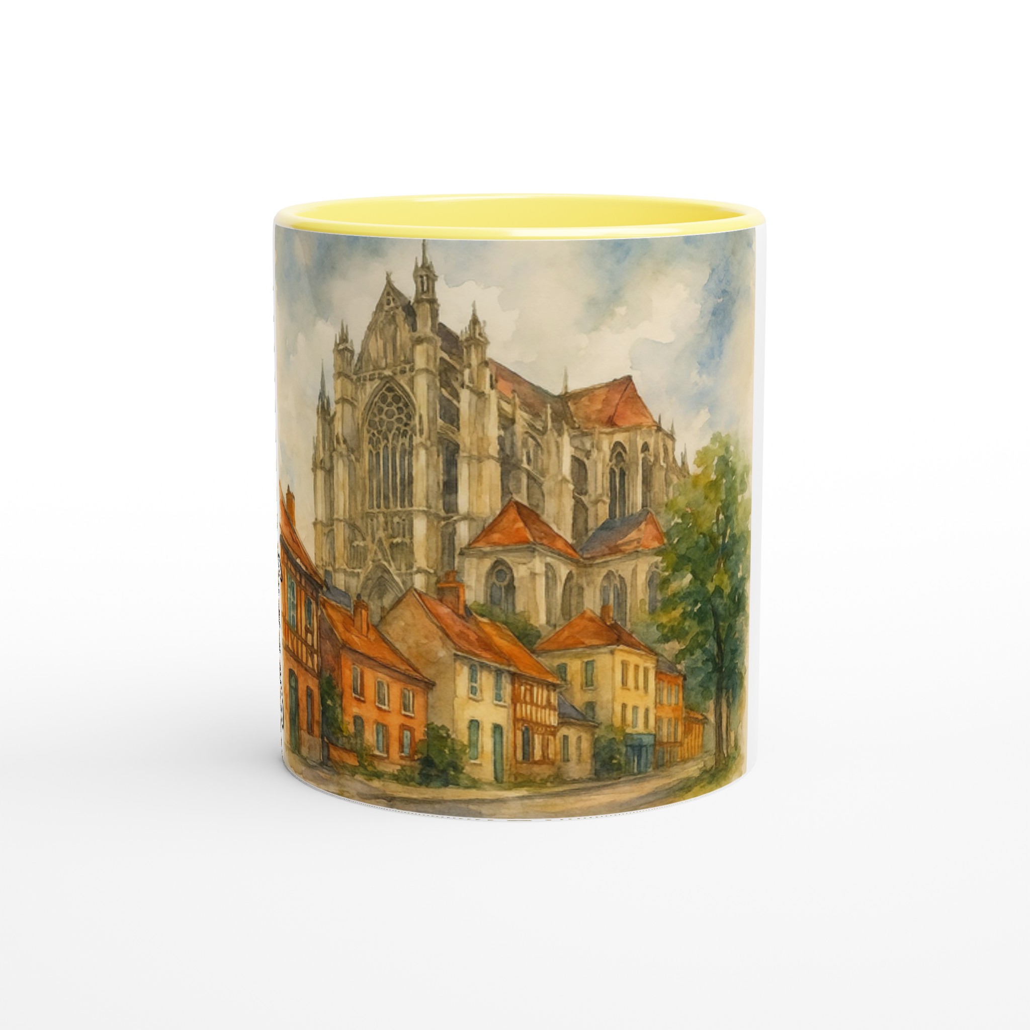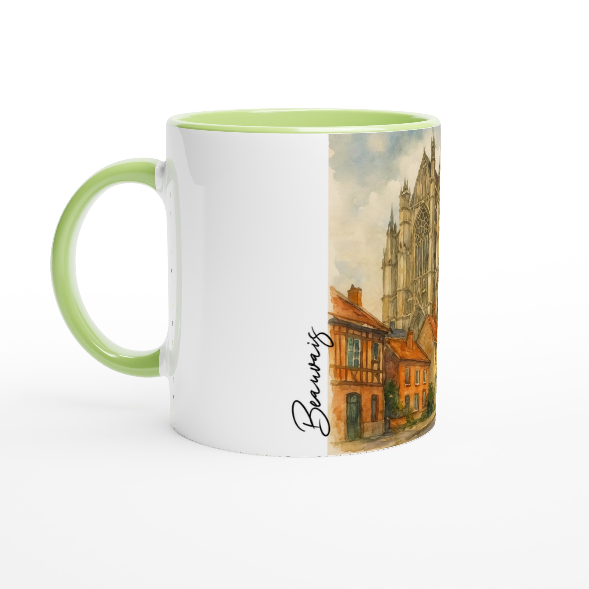 Mug en céramique Beauvais illustré d’une aquarelle de la cathédrale Saint-Pierre et des maisons anciennes. Intérieur coloré, impression HD durable, compatible micro-ondes et lave-vaisselle.