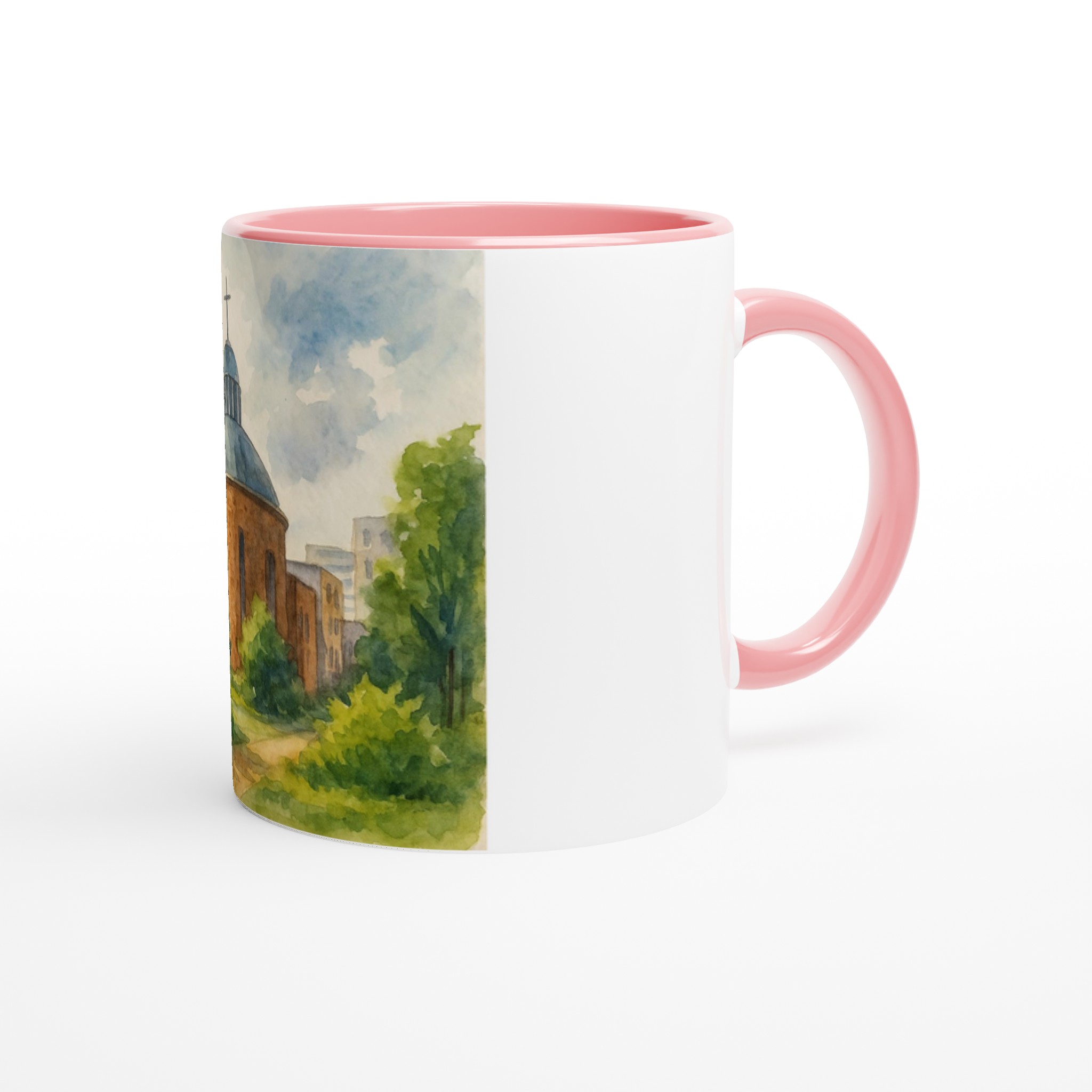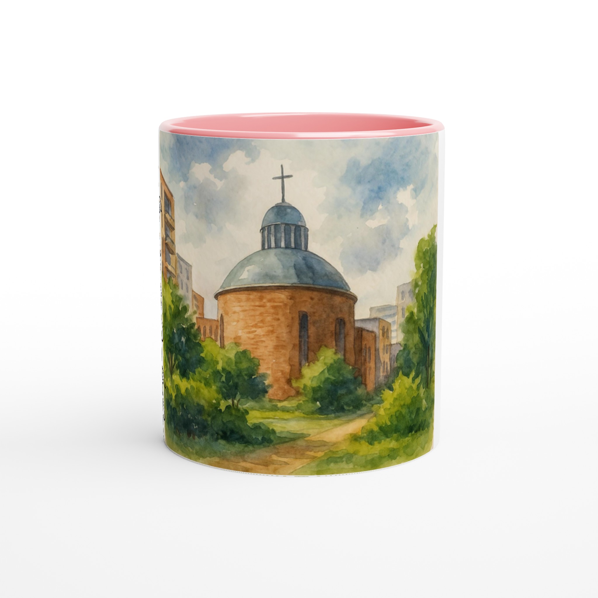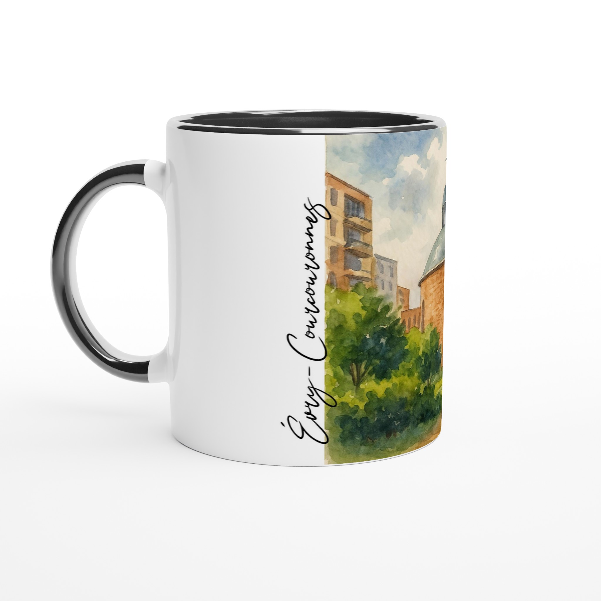 Ce mug en céramique Évry-Courcouronnes met en lumière l’une des silhouettes les plus emblématiques de la ville à travers une illustration en aquarelle douce et lumineuse. La scène représente la cathédrale d’Évry, reconnaissable à sa forme circulaire et à son dôme surmonté d’une croix, entourée de verdure et intégrée dans un paysage urbain contemporain.