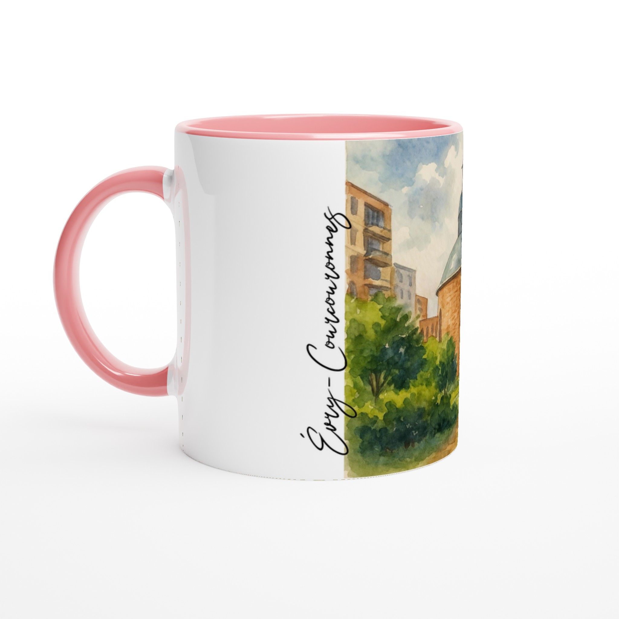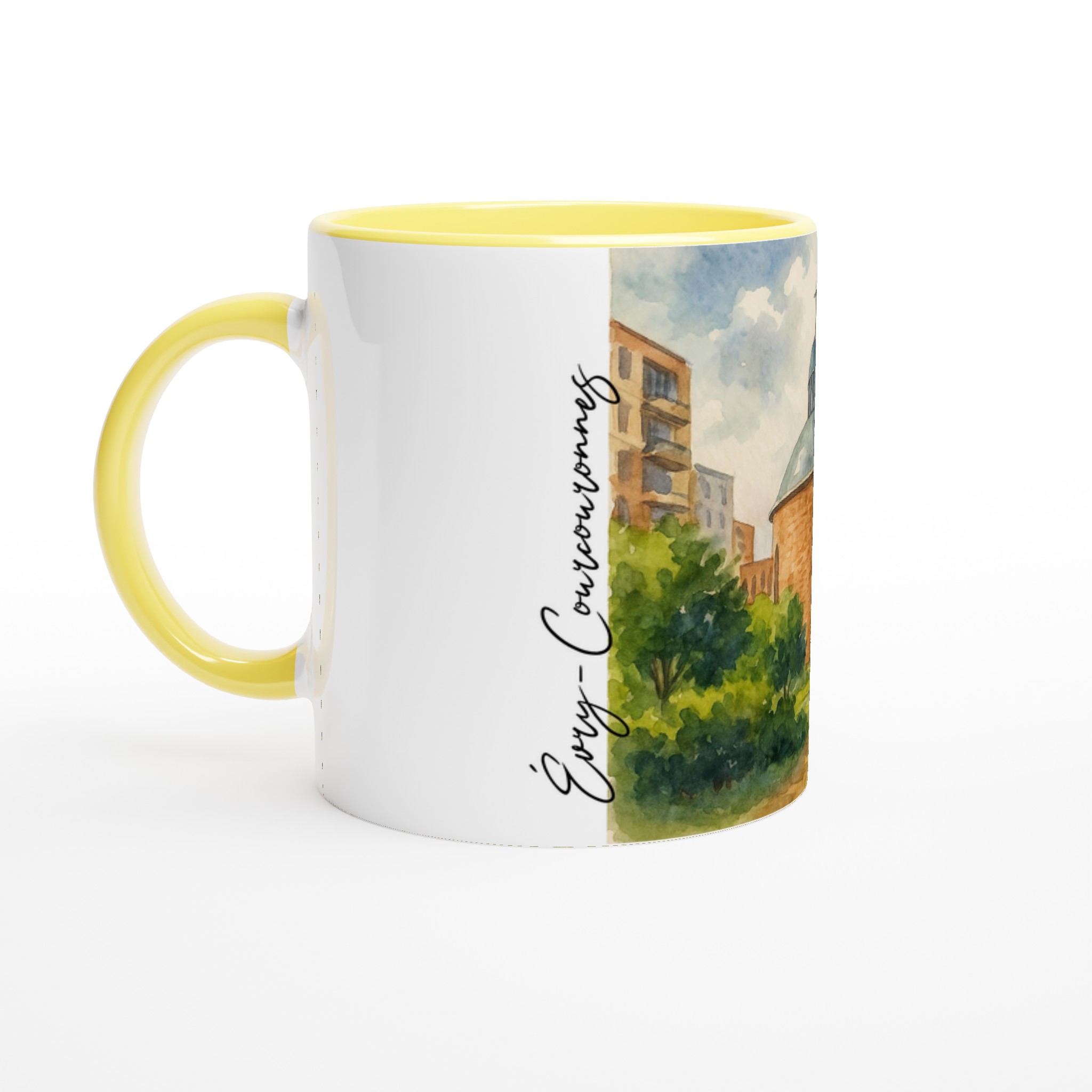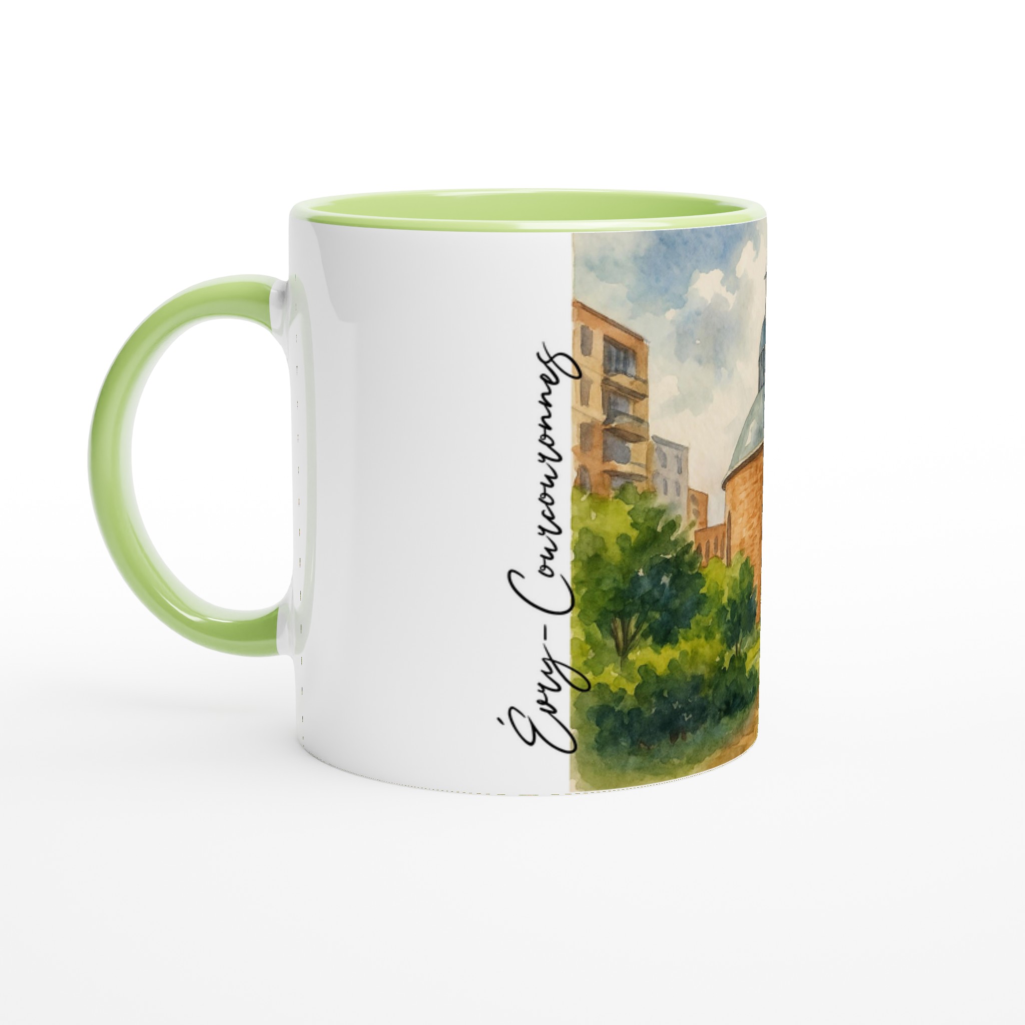 Mug en céramique Évry-Courcouronnes illustré d’une aquarelle douce représentant la cathédrale et les espaces verts environnants. Impression HD durable, intérieur coloré, compatible micro-ondes et lave-vaisselle.