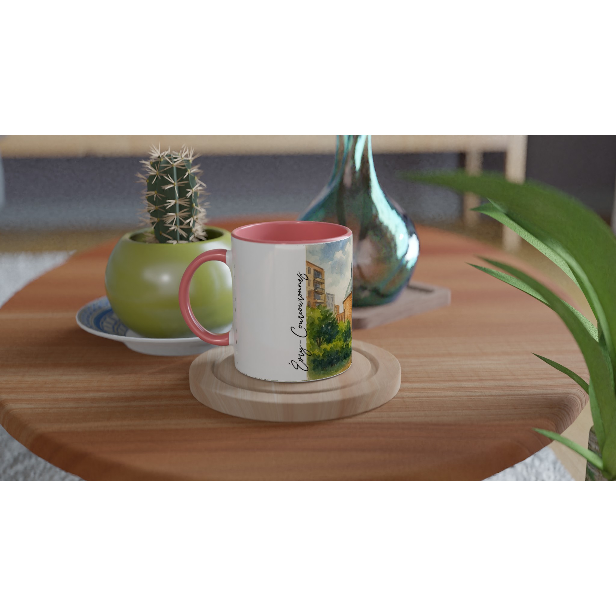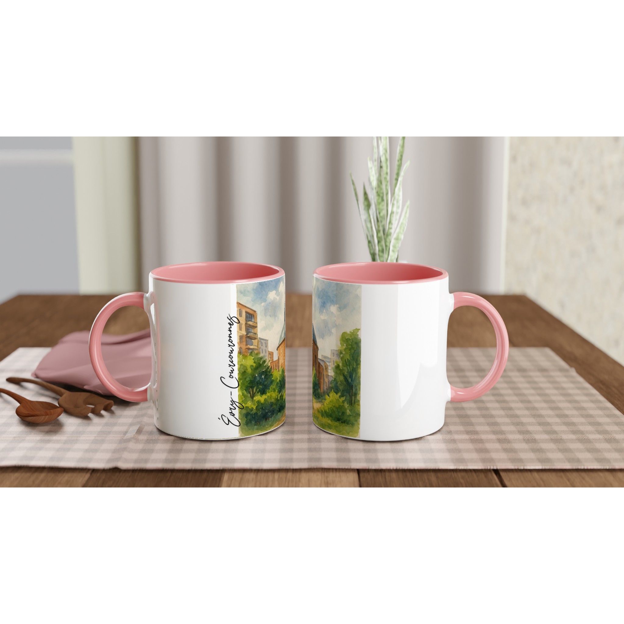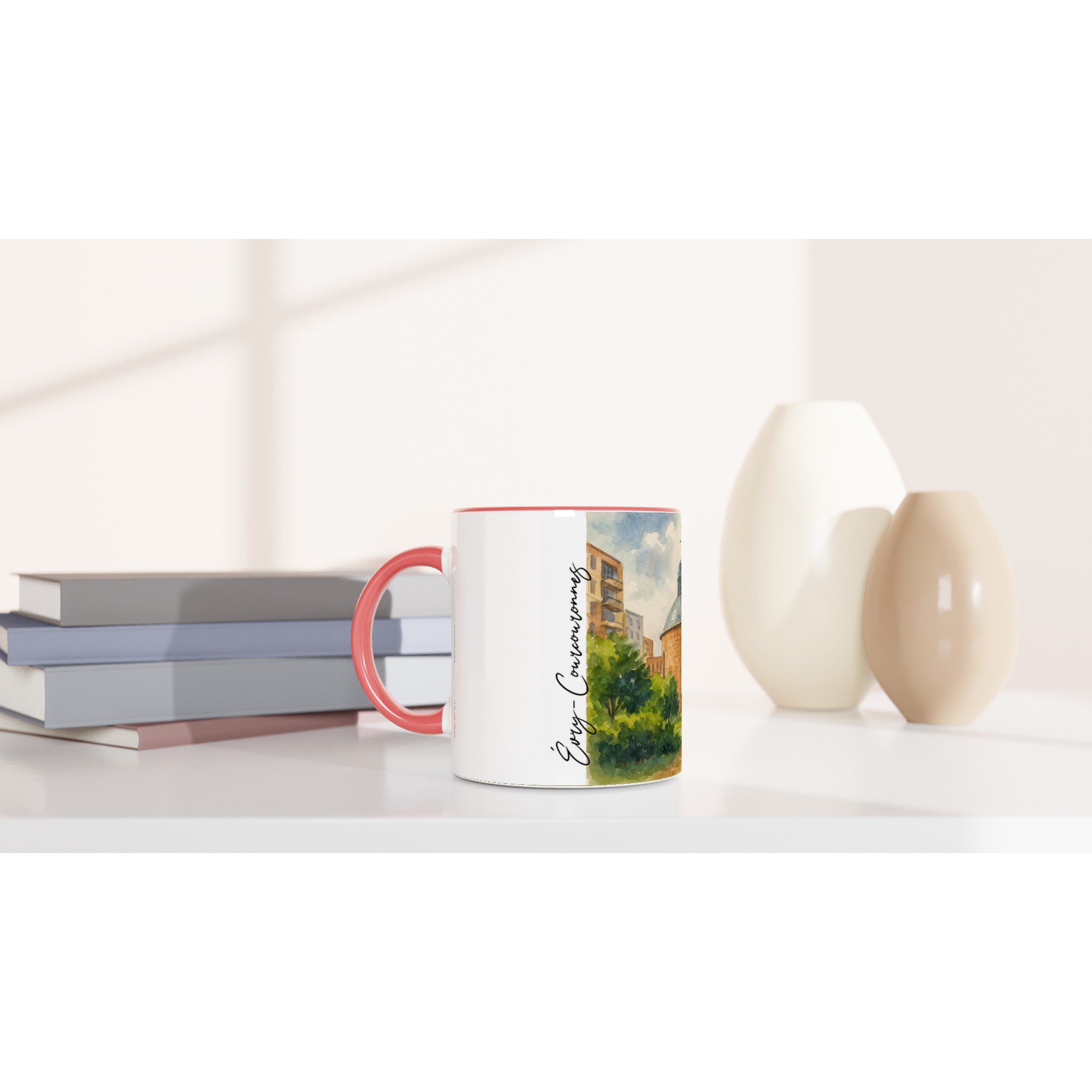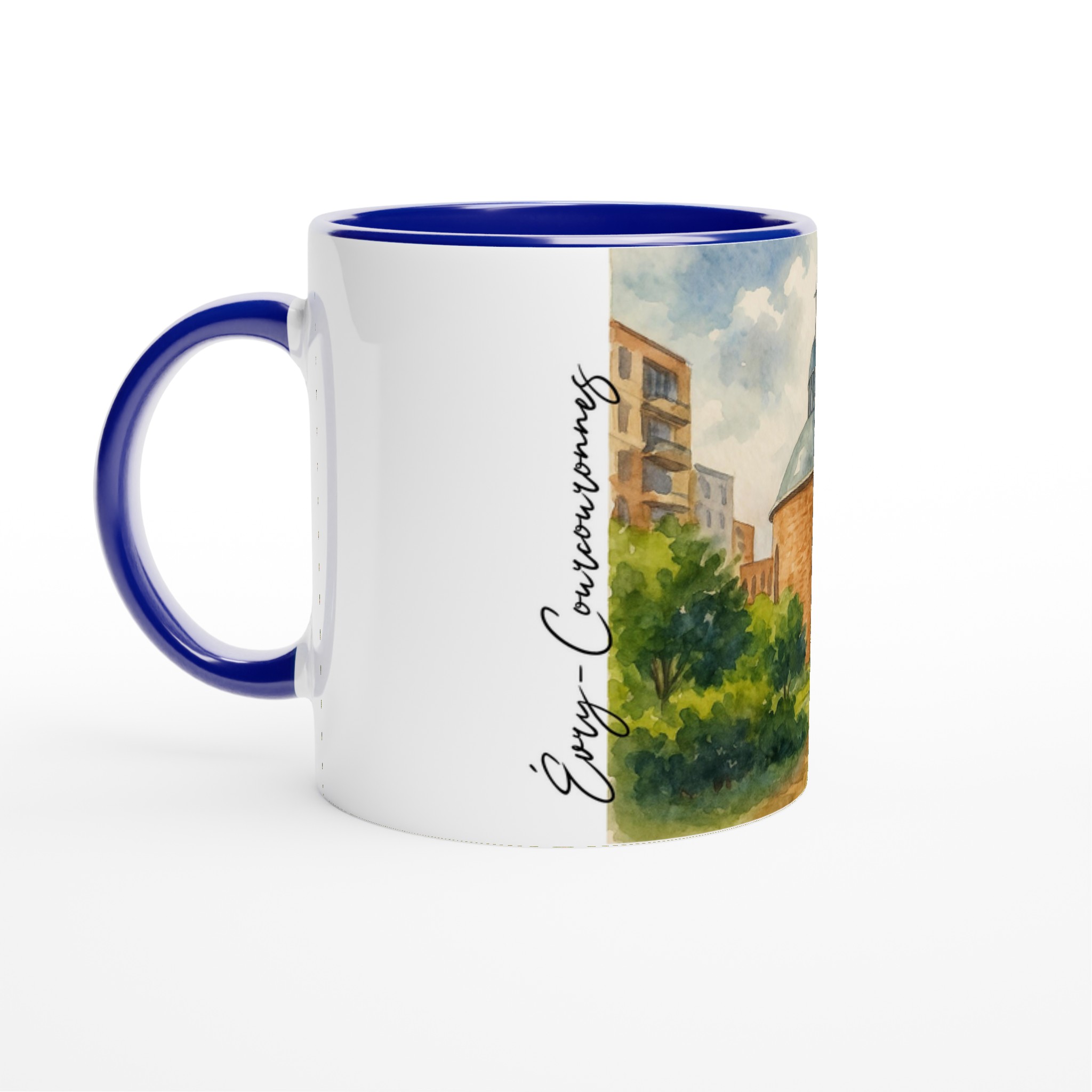 Mug en céramique Évry-Courcouronnes illustré d’une aquarelle douce représentant la cathédrale et les espaces verts environnants. Impression HD durable, intérieur coloré, compatible micro-ondes et lave-vaisselle.